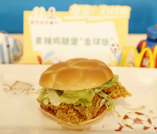 麥當(dāng)勞中國(guó)最受歡迎的漢堡單品——麥辣雞腿漢堡,在FIFA世界杯期間搖身一變“金球版”,蓋上足球形狀堡頂,F(xiàn)IFA世界杯期間10元限時(shí)特價(jià)