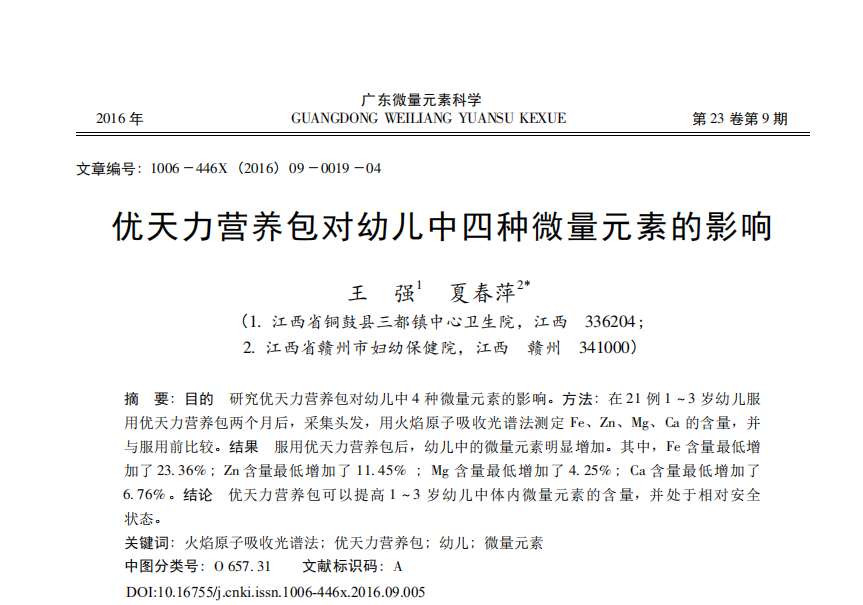 王強(qiáng),夏春萍.優(yōu)天力營養(yǎng)包對(duì)幼兒中四種微量元素的影響[J].廣東微量元素科學(xué),2016