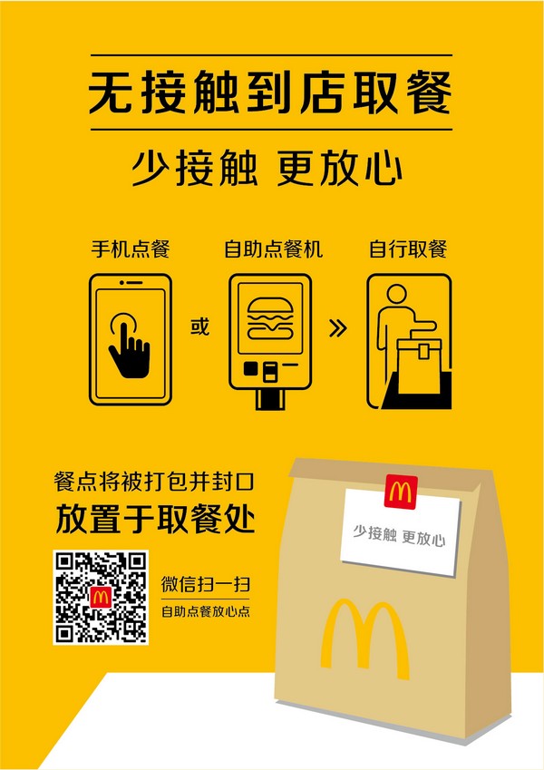 為了讓顧客放心,麥當勞在安全服務的前提下,餐廳實施“無接觸配送”和“無接觸到店取餐”。所有外送訂單均附上“麥樂送放心卡”,標注生產、配膳、外送人員姓名及體溫,做到餐品、人員可追蹤。顧客可選擇讓外送員將餐品送到指定位置取餐,在手機、餐廳自助點餐機或柜臺點餐后,無論堂食或外帶,員工都會將制作好的餐點裝入打包袋并封口,放置到取餐處。