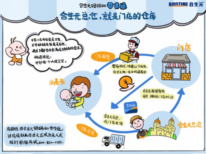 顧客因道路封閉等原因在老家,需要奶粉,和原來常住地的母嬰門店老板下單。如果原來母嬰門店無法寄送產(chǎn)品到異地的消費者,母嬰門店老板把需求報給合生元媽媽100零售通,合生元從自己的總倉出貨快遞,利潤還計入原來門店的賬上。