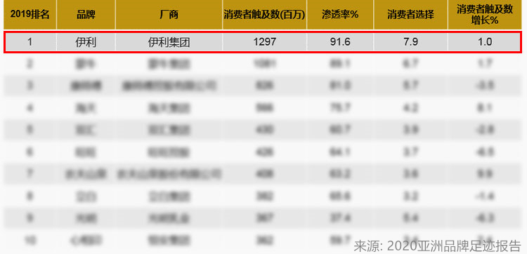 見(jiàn)圳客戶(hù)端·深圳新聞網(wǎng)2020年6月23日訊 日前,凱度消費(fèi)者指數(shù)發(fā)布了《2020亞洲品牌足跡報(bào)告》。伊利憑借91.6%的品牌滲透率、近13億的消費(fèi)者觸及數(shù)和近8次的購(gòu)買(mǎi)頻次,連續(xù)五年位列中國(guó)市場(chǎng)消費(fèi)者選擇最多的品牌榜首。綜合報(bào)告數(shù)據(jù)顯示,伊利各項(xiàng)指標(biāo)在榜單中領(lǐng)先于其他品牌,持續(xù)領(lǐng)跑中國(guó)快消品市場(chǎng)。