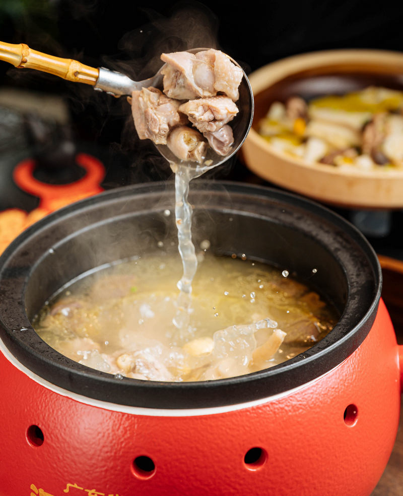 以雞為主要烹飪食材,洞庭土雞館的湖南師傅創(chuàng)造出了不一樣的菜肴。每桌食客坐下,都少不得一碗暖乎乎的洞庭土雞湯來“開場”。它的登場也相當(dāng)有氣勢,長沙紅磚窯特別定制的大湯鍋,內(nèi)膽是紫砂構(gòu)造,這樣的設(shè)計(jì)既是出于美觀,又是出于更長時(shí)間更有效保溫的效果。俗話說得好,工欲善其事必先利其器。土雞方面,師傅特別精選了湖南竹山雞,肉質(zhì)的彈性略勝一籌,據(jù)介紹,竹山雞的養(yǎng)殖戶開放了大片山頭讓雞跑,放養(yǎng)時(shí)間足夠長,達(dá)到一年多,在如今快節(jié)奏的社會(huì)里已實(shí)屬難得。老雞加山泉水文火熬3個(gè)小時(shí),并沒有其他的味道干擾,簡簡單單就是本味。