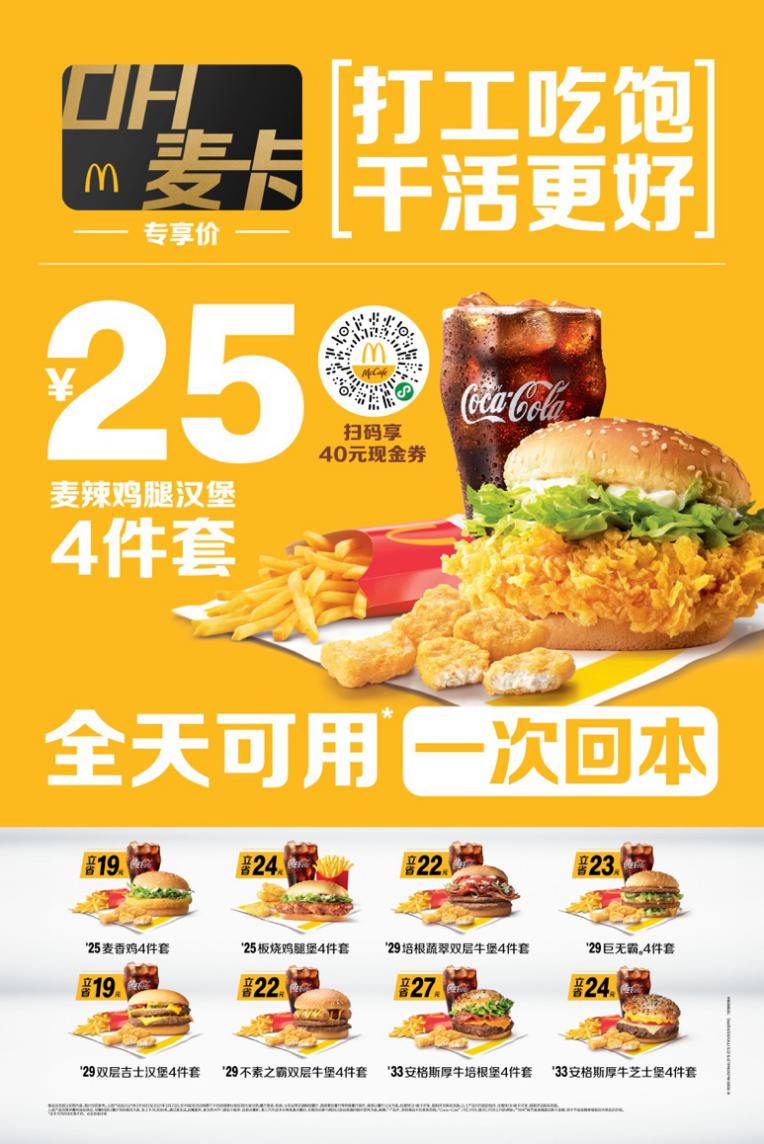 調(diào)研還顯示,超過(guò)四成的消費(fèi)者表示希望在餐飲上節(jié)約至少10%的支出,而麥當(dāng)勞的“打工人保底計(jì)劃”提供了多種大力度的優(yōu)惠。以午餐為例,消費(fèi)者若購(gòu)買OH麥卡,享用超值四件套即可至少節(jié)省19元,即減少39%的開(kāi)支。