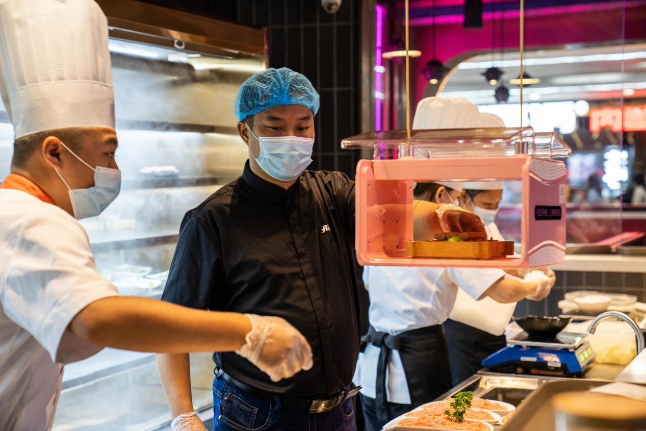 值得一提的是,除了地道的火鍋美食,這家餐廳的特別之處,在于高科技智能機器人的廣泛應(yīng)用。在餐廳過道里,一款名為“蠶豆”的配送機器人來回奔忙,把各式菜品有條不紊地送達顧客桌前。半空中,高效穿梭的云軌小車將菜品傳送到餐桌,“從天而降”呈現(xiàn)在顧客面前,科技體驗感十足。這款“天降”智能云軌傳輸系統(tǒng),由智能配餐、智能云軌兩大模塊構(gòu)成。顧客通過手機下單后,智能配餐系統(tǒng)接到指令,能自動將相應(yīng)菜品餐食分配給云軌小車,高效、快速地配送到對應(yīng)餐桌,整個送餐過程實現(xiàn)“零接觸”,在高效率的同時,確保了安全衛(wèi)生。
