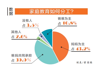 此次調(diào)查中,用14個指標(biāo)考察家庭教育分工情況,包括:輔導(dǎo)孩子學(xué)習(xí)、培養(yǎng)孩子特長、接送孩子上下學(xué)、開家長會、培養(yǎng)孩子日常行為習(xí)慣、糾正孩子的不良行為、教孩子明辨是非、照顧孩子的飲食起居、和孩子一起游戲及和孩子聊天。統(tǒng)計數(shù)據(jù)顯示,家庭教育分工中,“媽媽為主”的家庭占43.2%,“爸爸為主”占10.8%,“爸媽共同承擔(dān)”占39.9%,“其他人做”占2.6%,“沒有人做”占3.5%。