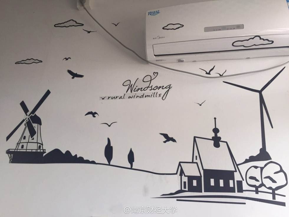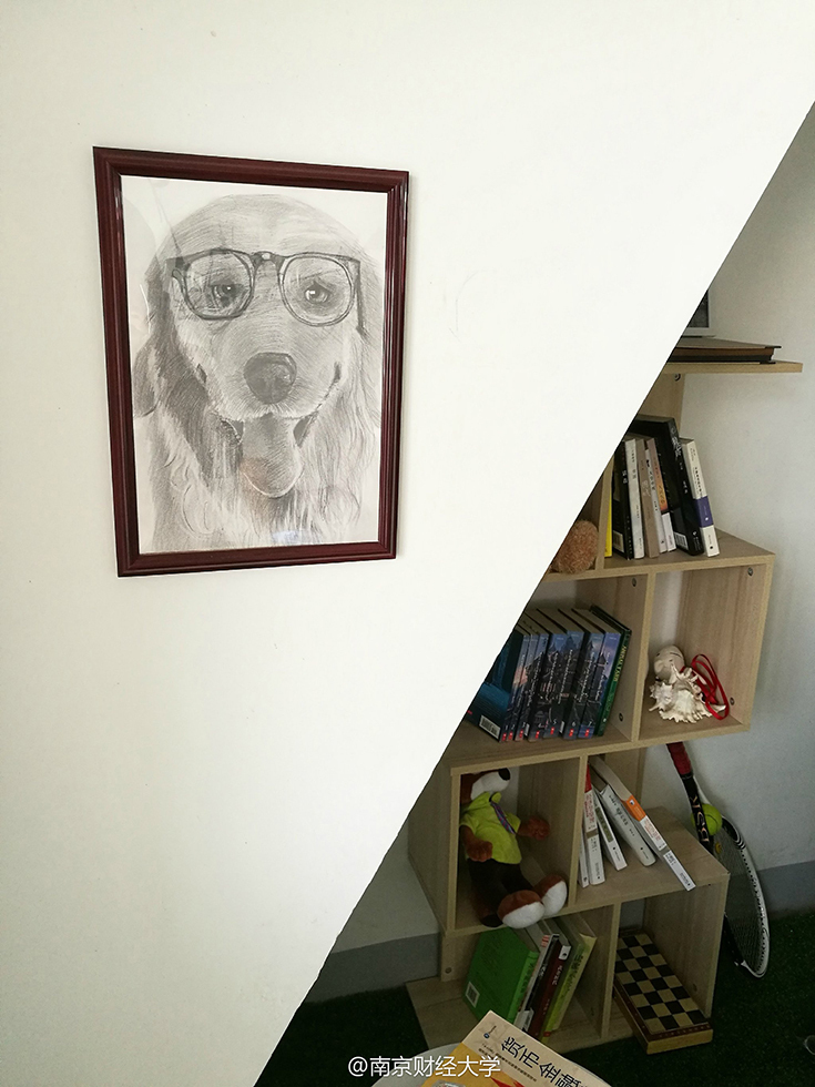墻上一幅戴著眼鏡的小狗素描圖格外引人注目,它是由602舍長(zhǎng)涂貴平親手畫的?!斑@幅畫還是去年自己參加了一個(gè)帶有公益性質(zhì)的畫畫班學(xué)的,我也沒想到能畫成這樣。”來自貴州的涂貴平害羞地說,其實(shí)裝飾寢室的初衷很簡(jiǎn)單,錢就花了300塊不到,主要是希望大學(xué)四年能住在干凈的環(huán)境。