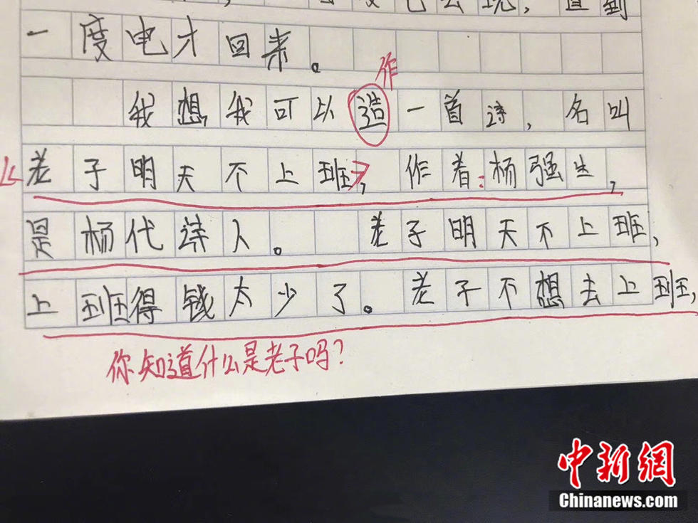 近日,貴州省谷隴翁板小學(xué)的語文老師張沁文,曬出了學(xué)生寫在作業(yè)里的“金句”。“老師,你太自戀了,QQ空間都是自己照片”;“顏值升高才有人喜歡您”……孩子們的童言無忌令人哭笑不得,老師的評論也很亮眼。