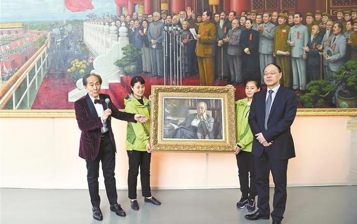 ▲劉宇一(左一)向深圳大學(xué)贈畫。深圳晚報記者 馮明 攝