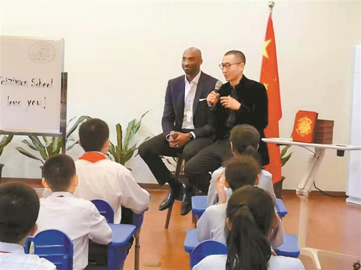“來了,來了!”隨著人群的騷動(dòng),一個(gè)高大的身影閃了進(jìn)來,科比手捧一束鮮花來到了課堂??票鹊牡絹恚尨蠹艺笪W?,聽從偶像的人生教誨。