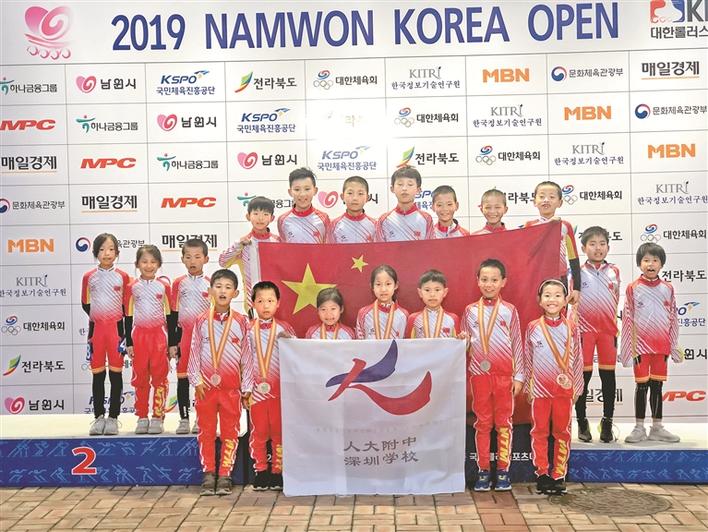 晶報05月16日訊  近日,韓國南原國際輪滑公開賽順利舉行,吸引了來自全球16個國家和地區(qū)的1000多名優(yōu)秀運動員參賽。晶報記者從人大附中深圳學(xué)校獲悉,該校小學(xué)輪滑隊的11名選手首次代表中國MX青少年隊參加了本次國際輪滑公開賽的小學(xué)(1&2年級)的項目比賽,經(jīng)過激烈角逐,喜獲2金4銀13銅。值得一提的是,這是剛成立一年的人大附中深圳學(xué)校輪滑隊隊員們在國際舞臺上的首次亮相。學(xué)校以愛與尊重為核心理念,注重學(xué)生的全面發(fā)展,并注重突出發(fā)展學(xué)生特長,充分挖掘?qū)W生潛力,開設(shè)了豐富多元的課程,其中,開設(shè)了輪滑課等必修課,以及舞蹈、國際象棋等特色課程。