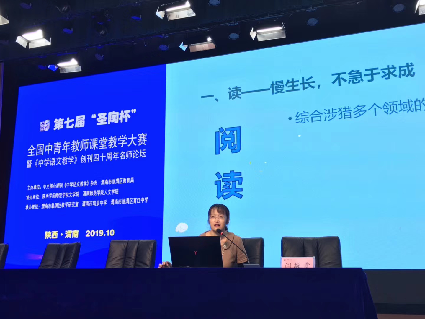 《中學語文教學》創(chuàng)刊于1979年,是全國中文核心期刊,其主辦的“圣陶杯”是中學語文界的重要權(quán)威賽事,每兩年舉辦一屆,今年已經(jīng)是第七屆。2013年,閆敬霞老師代表廣東省參加第四屆“圣陶杯”全國中青年教師課堂教學大賽,并獲得高中組第一名。