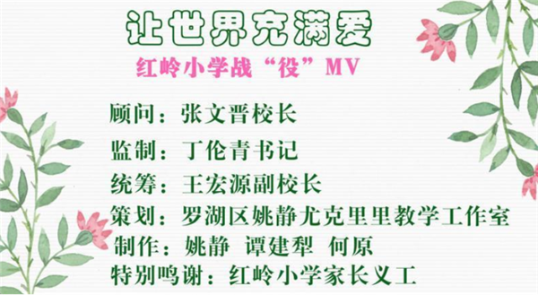 經(jīng)過學(xué)校老師、家長們的共同努力,3月23日,全長6分零6秒的紅嶺小學(xué)戰(zhàn)疫M(jìn)V《讓世界充滿愛》順利完成。該片通過紅嶺小學(xué)微信公眾號首發(fā),目前,已在深圳晚報(bào)、晶報(bào)、深圳新聞網(wǎng)等多家主流媒體平臺(tái)傳播。