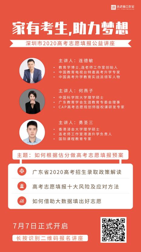作為此次深圳市2020高考志愿填報(bào)公益講座的主辦方,連老師工作室負(fù)責(zé)人連德敏博士聯(lián)合海內(nèi)外著名教育學(xué)者和業(yè)內(nèi)知名高考升學(xué)教育專家,在生涯視角、以“人”優(yōu)先和實(shí)戰(zhàn)派三大核心理念下,聚焦于我國高中階段生涯規(guī)劃教育、高考升學(xué)規(guī)劃、新高考選科、學(xué)業(yè)規(guī)劃的教育研究與咨詢服務(wù),為廣大家長、學(xué)生提供高品質(zhì)高中生涯與升學(xué)規(guī)劃整體解決方案。