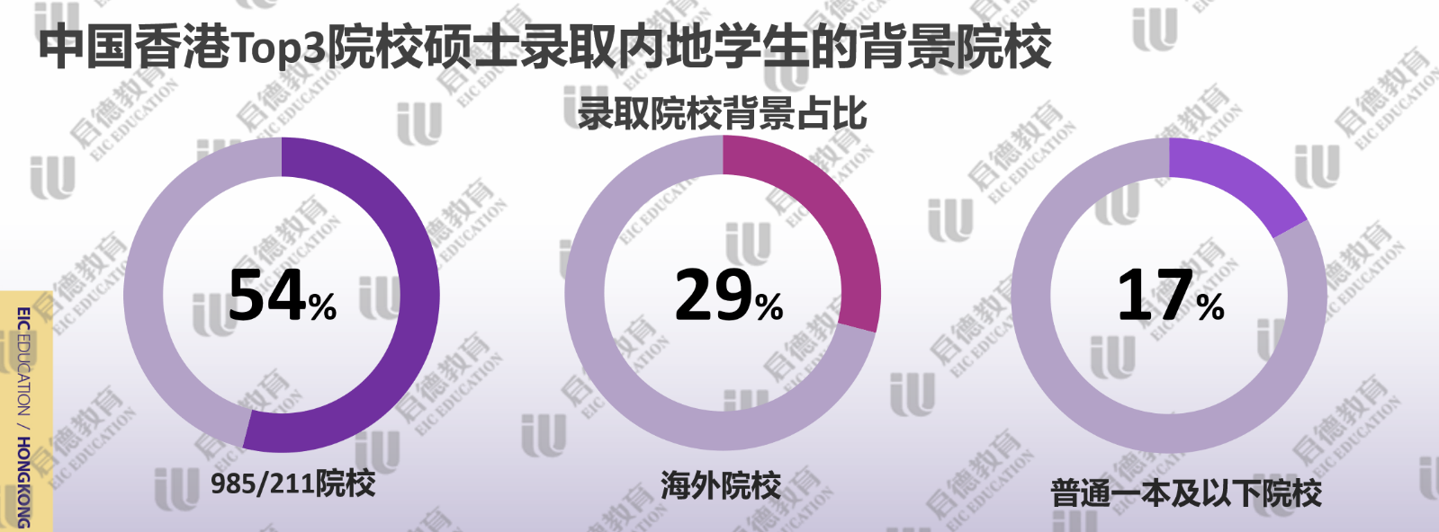 申請(qǐng)香港高校提交雅思成績(jī)較多,啟德留學(xué)2021客戶(hù)服務(wù)數(shù)據(jù)顯示,近3成錄取學(xué)生雅思成績(jī)達(dá)到7分或以上,主要集中在金融、會(huì)計(jì)、傳媒、英語(yǔ)教育等熱門(mén)專(zhuān)業(yè);雅思達(dá)到6.5分占比幾乎一半,代表了香港高校錄取學(xué)生的平均水平;雅思6分占比不到四分之一,主要分布于理工科或冷門(mén)專(zhuān)業(yè)。香港TOP3名校(香港大學(xué)、香港科技大學(xué)、香港中文大學(xué))錄取的碩士學(xué)生中,985/211院校背景的學(xué)生超過(guò)了一半;因疫情因素導(dǎo)致海外留學(xué)生的回流,近30%的碩士學(xué)生來(lái)自于海外院校本科;雙非院校的占比僅為17%,集中于需要豐富實(shí)習(xí)和工作經(jīng)驗(yàn)的理工科。擁有實(shí)習(xí)/科研等經(jīng)歷占比為99%,其中,超八成學(xué)生完成了3次以上的實(shí)習(xí)/科研。