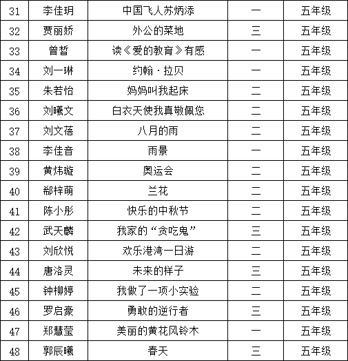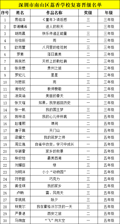 自2021年1月,活動征稿啟動以來,獲得了深圳市廣大中小學(xué)生、教師、文學(xué)愛好者的熱烈響應(yīng)積極參與,吸引了深圳百余所學(xué)校的上萬人關(guān)注報名?,F(xiàn)公布南山區(qū)荔香學(xué)校晉級復(fù)賽名單如下: