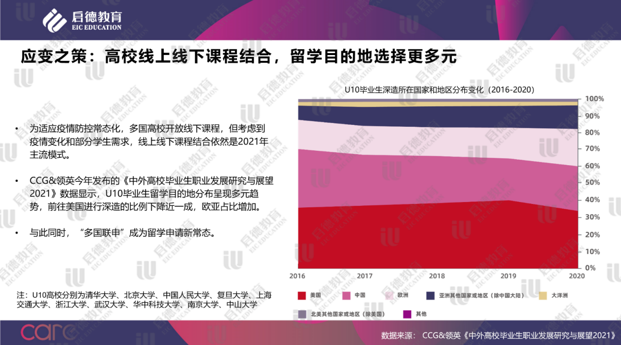 全球化智庫與領英發(fā)布的《中外高校畢業(yè)生職業(yè)發(fā)展研究與展望2021》數(shù)據(jù)顯示,中國 U10 (清華大學、北京大學、中國人民大學、復旦大學、上海交通大學、浙江大學、武漢大學、華中科技大學、南京大學、中山大學 )畢業(yè)生繼續(xù)深造的國家與地區(qū)選擇更趨多樣化,前往美國留學的比例下降近一成,留學亞洲與歐洲的占比增加。