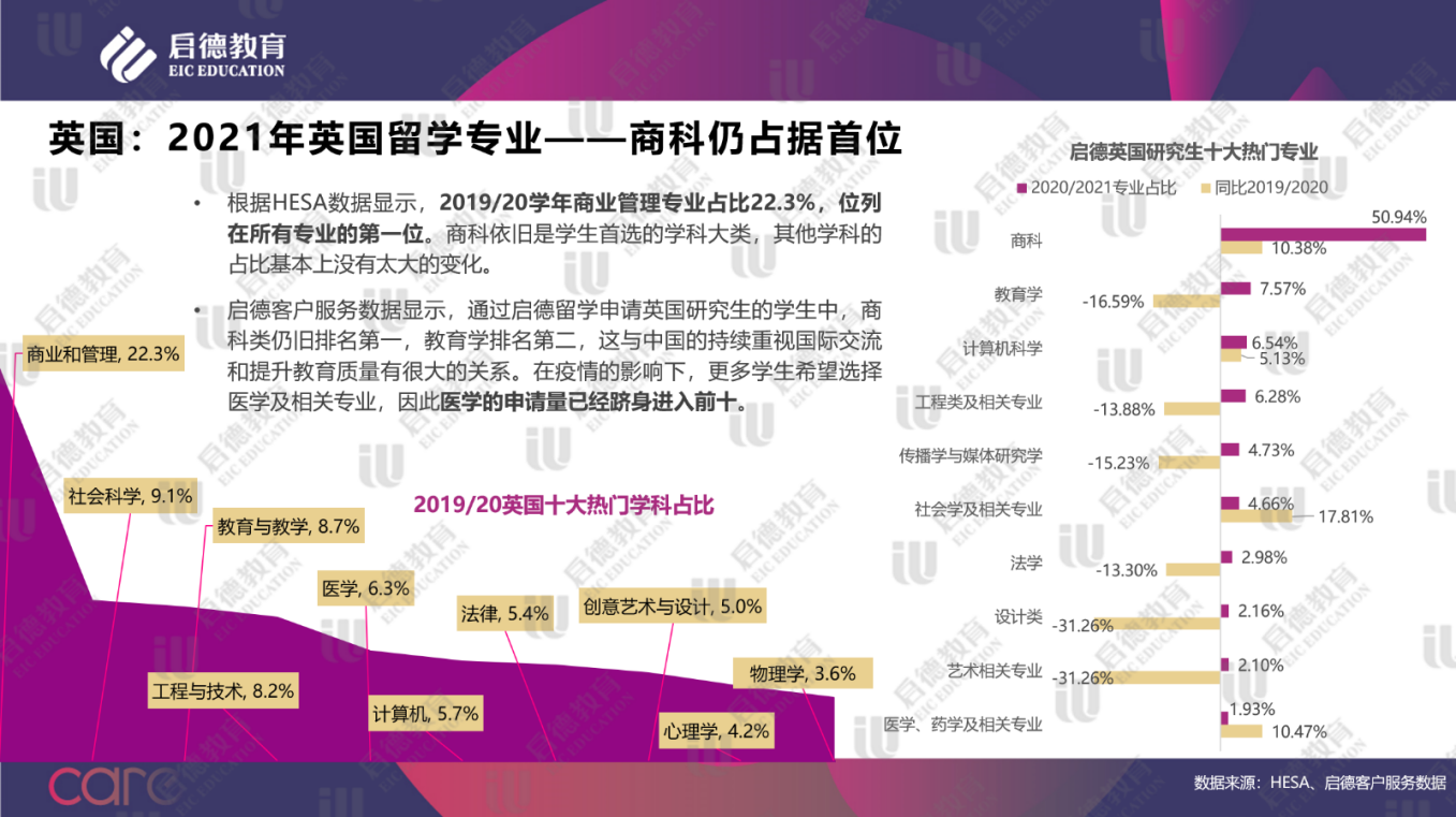 長期以來,由于其廣闊的就業(yè)前景,F(xiàn)AME專業(yè)(金融、會計、管理、經(jīng)濟)和STEM專業(yè)(科學、技術、工程和數(shù)學)一直備受留學生的青睞。2021 《美國門戶開放報告》數(shù)據(jù)顯示,半數(shù)以上的中國內(nèi)地學生就讀STEM專業(yè)(物理/自然科學、工程學、醫(yī)療健康、數(shù)學 /計算機 ),16.6%就讀商業(yè)與管理專業(yè)。英國高等教育統(tǒng)計局 HESA數(shù)據(jù)顯示,2019/20學年商業(yè)管理專業(yè)占比為22.3%,位列在英國研究生專業(yè)的第一位,其他依次為:社會科學、教育與教學、工程與技術、醫(yī)學、計算機、法律、創(chuàng)意藝術與設計、心理學以及物理學。