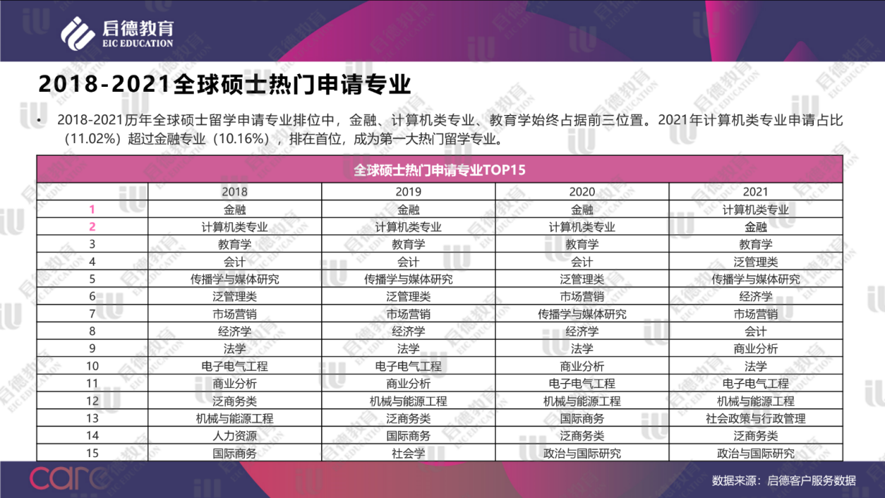 啟德留學客戶服務數(shù)據(jù)顯示,2018-2021歷年全球碩士留學申請專業(yè)排位中,金融、計算機類專業(yè)、教育學始終占據(jù)前三位置。2021年,計算機科學與信息系統(tǒng)(偏理科)、計算機科學與信息系統(tǒng)(偏工科)、電子與計算機工程、數(shù)據(jù)科學這四個計算機類專業(yè)的碩士申請占比合計為11.02%,超過金融專業(yè)(10.16%),成為第一大熱門留學專業(yè)。2021商科申請占比超過40%,理工科申請占比超過四分之一。其中,商科熱門碩士專業(yè)金融(10.16% )、經(jīng)濟學(4.63% )、市場營銷(4.43% )、會計(3.92% )、商業(yè)分析(2.99% )的申請占比為26.13%,理工科熱門碩士專業(yè)計算機(11.02% )、電子電氣工程(2.66% )、機械與能源工程(2.15% )的申請占比為15.83%。