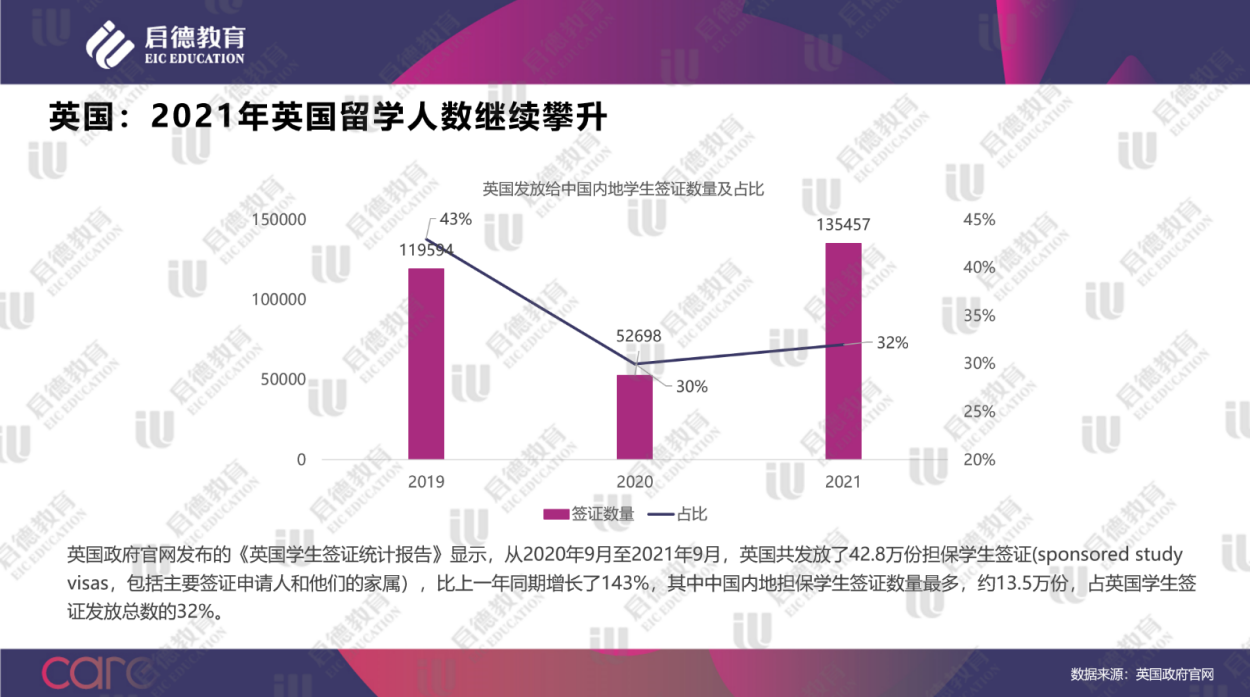 英國政府官網(wǎng)發(fā)布的《英國學生簽證統(tǒng)計報告》顯示,從2020年9月至2021年9月,英國共發(fā)放了42.8萬份擔保學生簽證(sponsored study visas,包括主要簽證申請人和他們的家屬),比上一年同期增長了143%,其中中國內(nèi)地擔保學生簽證數(shù)量最多,約13.5萬份,占英國學生簽證發(fā)放總數(shù)的32%。