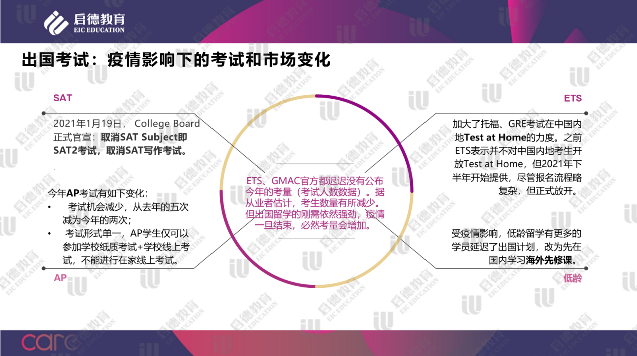 與此同時,國產(chǎn)疫苗被海外多國認可。此外,各種跡象表明,作為最主要的留學語言,2021年英語考試認證已放寬,考點也在增多。除了日本37所知名院校開展全英文授課外,韓國也可用英語成績遞交申請,法國提供1700個左右的英文授課課程,荷蘭碩士英語授課覆蓋率為95%,英語普及率在全世界非英語母語國家中最高。2021年1月19日,College Board正式宣布取消SAT Subject即SAT2考試,取消SAT寫作考試。2021年下半年 ETS對中國內(nèi)地考生開放Test at Home。同年,BC也在加快在中國內(nèi)地的雅思機考考點建設速度,計劃2022年將雅思機考考點覆蓋內(nèi)地四十多個城市。
