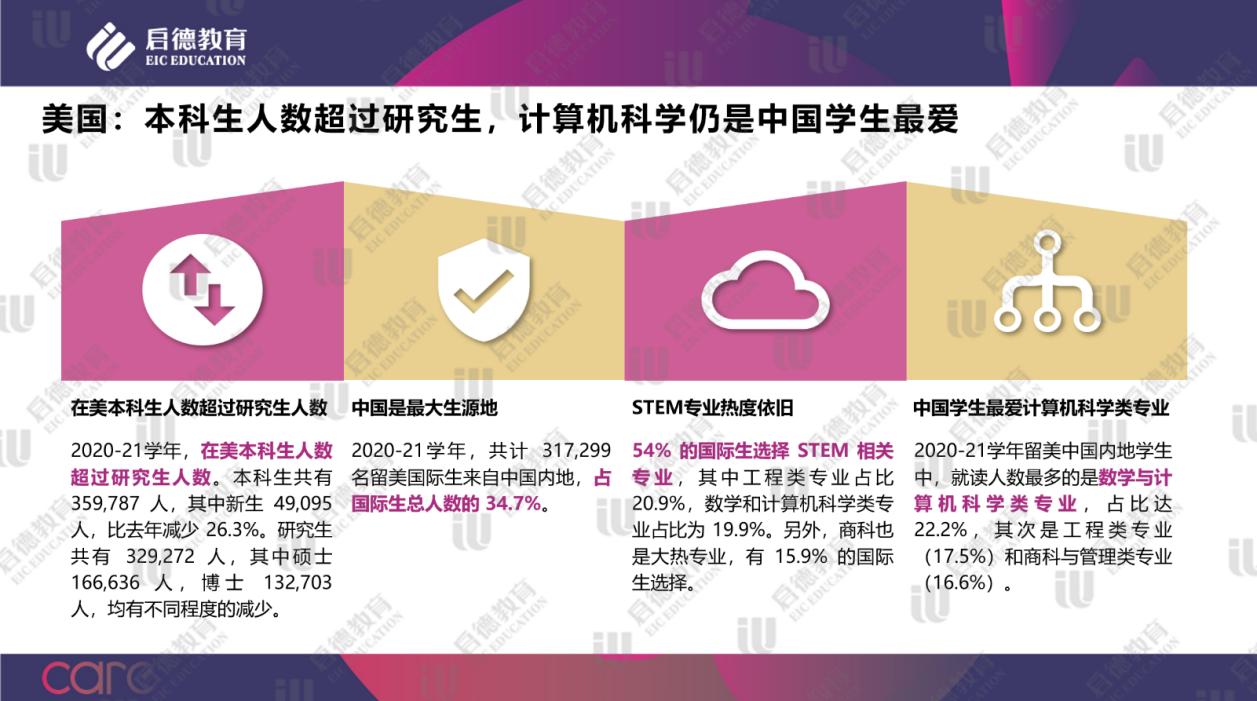 據(jù)2021 《美國門戶開放報告》數(shù)據(jù)顯示,2020/21學年共有914,095名國際學生在美國高等教育機構(gòu)學習,中國內(nèi)地(317,299人)依舊是美國最大的生源地區(qū),在國際學生中占比為34.7%,其中本研占比分別是39.6%與37.5%。