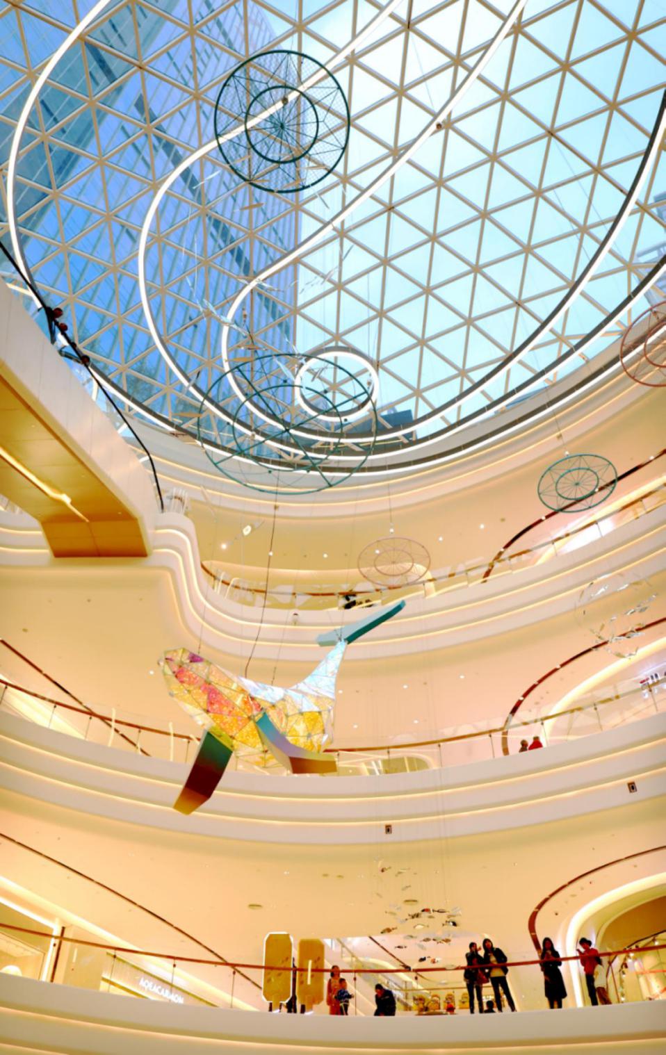 水中庭海之心 LED互動地幕秀,隨時與深海精靈上演親密接觸,內(nèi)設(shè)跨層螺旋星語滑梯,讓人們回歸童年的冒險世界;木中庭,“凈化”城市呼吸系統(tǒng)的鮮氧氣泡,向下“生長”的繁茂大樹,如同漫游在森意盎然的自然幻境;花中庭,澆灌“蒲公英”主題跨層挑臺,生長出城市里的秘密花園。同時,打造玻璃之森、室內(nèi)養(yǎng)魚池兩大自然微景觀,將生態(tài)之靈氣納入方寸之間。