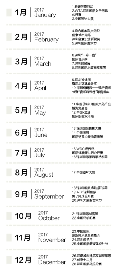 往細(xì)里說,“城市文化菜單”呈現(xiàn)出鮮明亮點(diǎn):一是國際化程度高。大部分活動都有國際權(quán)威和國家級專業(yè)機(jī)構(gòu)主辦或授權(quán)支持,不少活動代表了我國這一領(lǐng)域的最高水準(zhǔn),是可以代表深圳國際化城市形象的“文化大餐”。二是內(nèi)容豐富多彩。這份“菜單”表面上看只有28項,實際上每項活動時間跨度從幾天到一個多月不等,由十?dāng)?shù)項甚至上百項活動組成,各款“菜式”都有,不同口味的人都可以自行“看單點(diǎn)菜”。三是體現(xiàn)深圳特色?!安藛巍敝杏腥种坏幕顒优c創(chuàng)新創(chuàng)意有關(guān),正好體現(xiàn)了深圳“創(chuàng)新之城”、“設(shè)計之都”的城市特性,可謂是深圳的文化“特產(chǎn)”。四是新的品牌活動首次集體亮相。經(jīng)過多年培育,深圳已經(jīng)擁有文博會、高交會、讀書月、創(chuàng)意12月等傳統(tǒng)品牌活動,接下來還要精心打造一系列新的文化品牌活動。在這份“菜單”中,2016年及今年新創(chuàng)辦的就有深圳“一帶一路”國際音樂季、深圳國際科技影視周、深圳國際攝影大展、深圳設(shè)計周、中國圖片大賽等多項活動,文博會、新春關(guān)愛行動、國際魔術(shù)節(jié)等老牌活動也都將有新的策劃、新的提升,更具國際化內(nèi)涵。一句話,這份菜單共匯集了國際化、標(biāo)志性的品牌文化活動28項,涵蓋文化藝術(shù)、創(chuàng)意設(shè)計、科技創(chuàng)新、體育休閑等多個類別,是廣義的文化活動的概念。