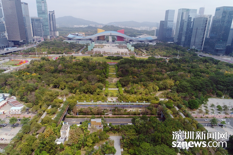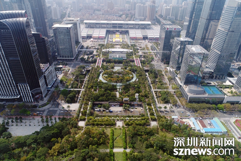2018年,深圳新聞網(wǎng)無(wú)人機(jī)拍攝下的福田中心區(qū)會(huì)展中心附近建筑群及綠地