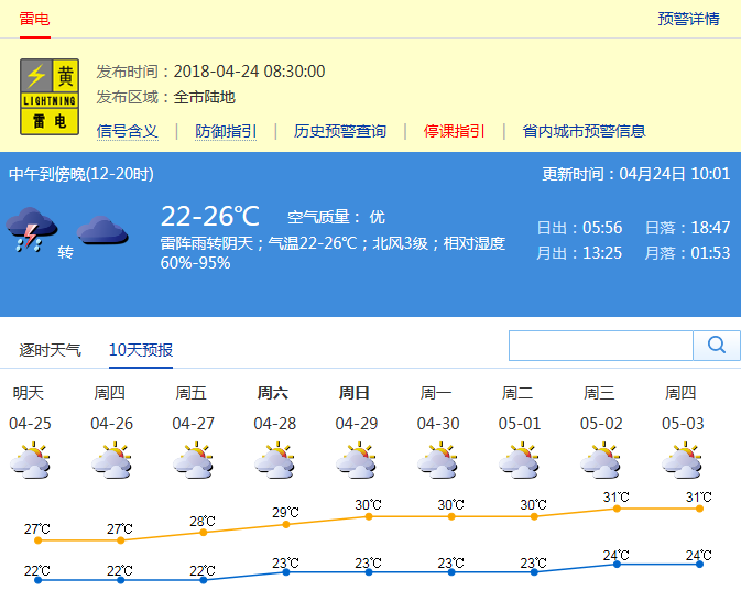 預(yù)計(jì)24日陰天有雷陣雨,有時(shí)雨勢較大,氣溫下降;25日降雨結(jié)束,轉(zhuǎn)多云,可見陽光。