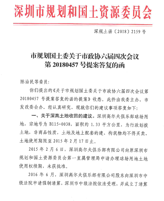 深圳新聞網(wǎng)記者注意到,2018年6月21日規(guī)土委給陳治民等政協(xié)委員的回復(fù)函中,將深圳高爾夫俱樂部球場(chǎng)用地到期后發(fā)生的事情,一一列了出來: