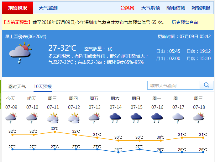 深圳市氣象臺(tái)預(yù)計(jì),9-10日我市多云有雷陣雨,部分時(shí)間雨勢(shì)較大,27-32℃,濕度65%-95%;11-12日天氣酷熱,能見度下降,有灰霾,可能出現(xiàn)局部強(qiáng)對(duì)流天氣;13-15日有一次較明顯的降水過程。