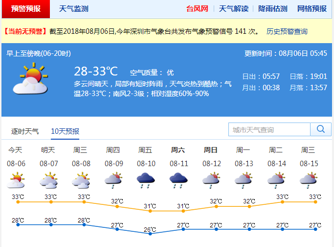 多云仍是今日深圳天氣的主格調(diào),部分時(shí)間陽(yáng)光猛烈,局部還會(huì)出現(xiàn)短時(shí)陣雨或雷陣雨。氣溫較高,最低氣溫在28℃左右,最高氣溫升至33℃左右,北部及人口密集區(qū)的氣溫將達(dá)34-35℃。外出應(yīng)注意防曬,中午前后應(yīng)減少戶外活動(dòng)。