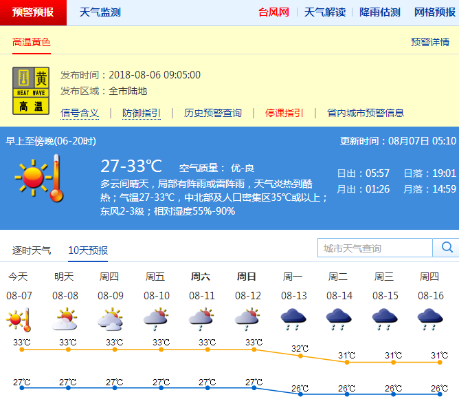 今日立秋,但深圳氣溫仍持續(xù)飆升,高溫黃色預(yù)警信號(hào)持續(xù)生效中。據(jù)市氣象臺(tái)消息,深圳今明兩天持續(xù)炎熱,最高氣溫33℃至34℃,局地35℃或以上。預(yù)計(jì)9日至12日受南海熱帶云團(tuán)影響降雨增多,部分時(shí)間雨勢(shì)較大。