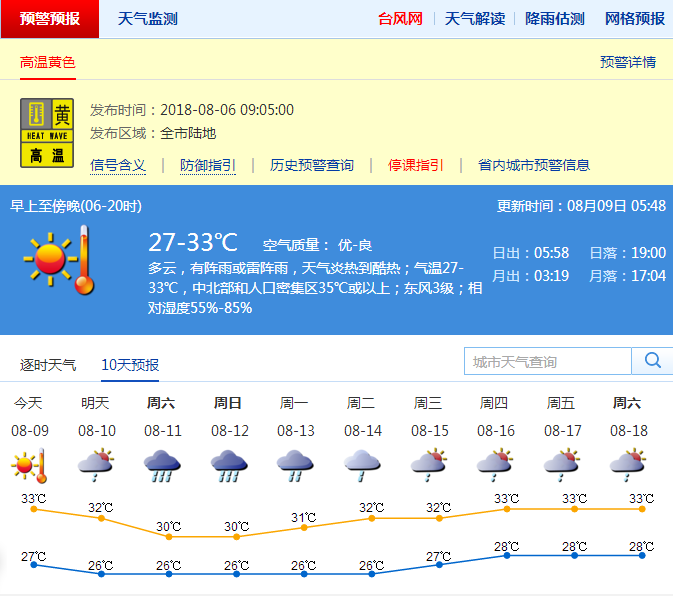 受熱帶云團影響,預計10日~13日(雷)陣雨增多,局部有暴雨,沿海和高地最大陣風6~7級,高溫天氣有所緩解。此外,位于菲律賓東部的熱帶低壓于8月8日中午加強為今年第14號臺風"摩羯"(熱帶風暴級),但對深圳無直接風雨影響。