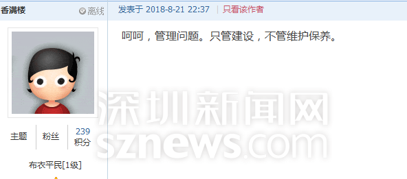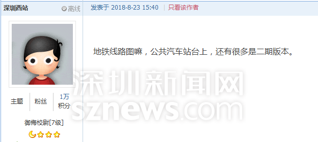 就此,網(wǎng)友“香滿樓”吐槽相關(guān)部門只管建設(shè),不管維護保養(yǎng)。網(wǎng)友“深圳西站”同時反映,深圳公共汽車站臺上,還有很多地鐵路線圖是二期版本。