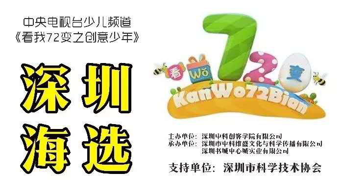 9月15日(本周六),央視“看我72變”欄目組將聯(lián)合深圳市科學(xué)技術(shù)協(xié)會(huì)、深圳市中心書城、中科創(chuàng)造力實(shí)驗(yàn)室,在中心書城大臺(tái)階舉辦第10屆“看我72變”之創(chuàng)意少年(深圳賽區(qū))的海選。只要你的孩子有創(chuàng)意有想法,都可以來(lái)到中心書城參加海選,發(fā)揮自我創(chuàng)意,結(jié)識(shí)新朋友。征集節(jié)目類型包括但不限于藝術(shù)創(chuàng)意表演:舞蹈、音樂(lè)、書法、輪滑、體育類等,科技創(chuàng)意:科技作品展示等,優(yōu)勝者將有機(jī)會(huì)登陸央視舞臺(tái)參加節(jié)目錄制。