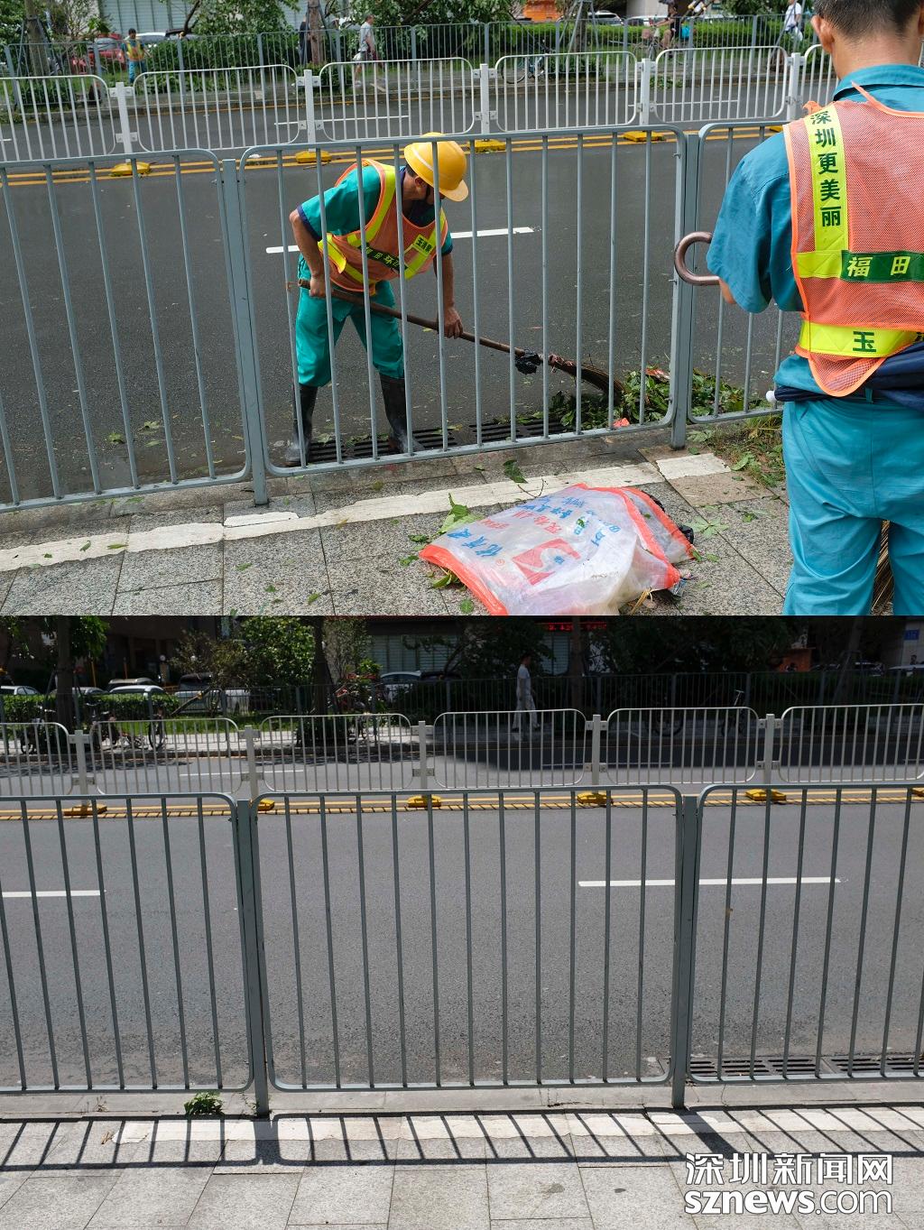 蓮花西地鐵站A出口前后對(duì)比圖(上圖:2018年9月17日,臺(tái)風(fēng)過后,路面一片狼藉,環(huán)衛(wèi)工人正在清掃。下圖 2018年9月18日下午五點(diǎn),路面清掃完畢,恢復(fù)整潔)