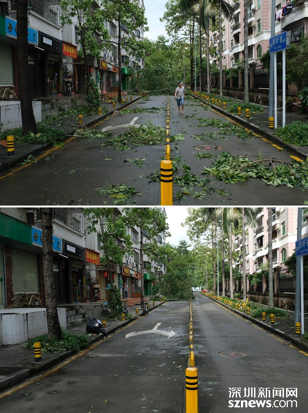 商報(bào)東二路翠葉道清理前后對(duì)比(上圖:2018年9月17日,臺(tái)風(fēng)過(guò)后,倒塌的樹(shù)木堵住路面,無(wú)法通行。下圖 2018年9月18日早上,樹(shù)木被清掃了一半,右車道可以通車)