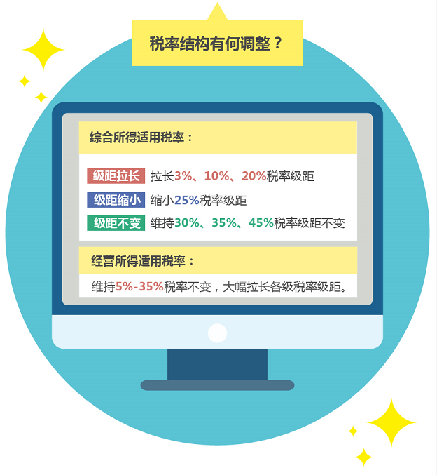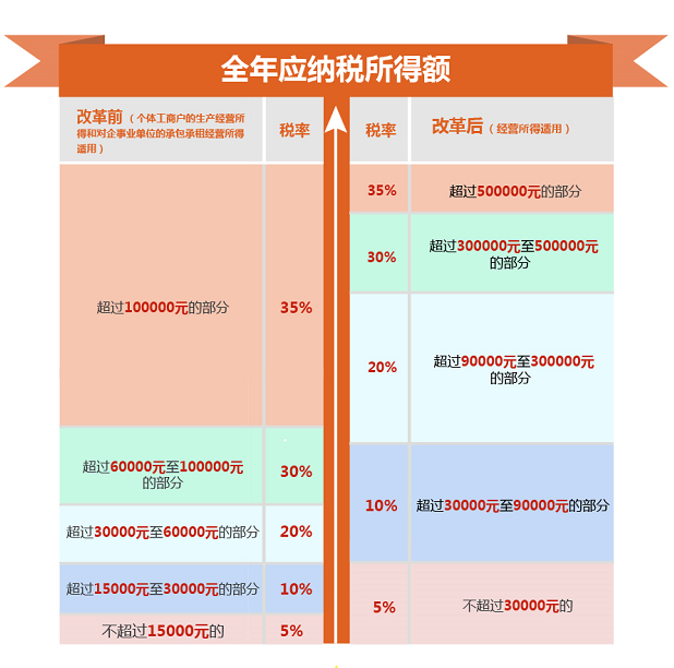 在稅率表的調(diào)整上,此次改革將更多地惠及中低收入群體,對(duì)勞動(dòng)性所得,以現(xiàn)行工薪所得3%-45%七級(jí)超額累進(jìn)稅率為基礎(chǔ),拉大3%、10%、20%三檔低稅率的級(jí)距,對(duì)經(jīng)營性所得,在維持現(xiàn)行5%-35%五級(jí)超額累進(jìn)稅率的基礎(chǔ)上,也適當(dāng)擴(kuò)大了各檔次稅率級(jí)距,減輕了廣大經(jīng)營業(yè)主的稅負(fù)。