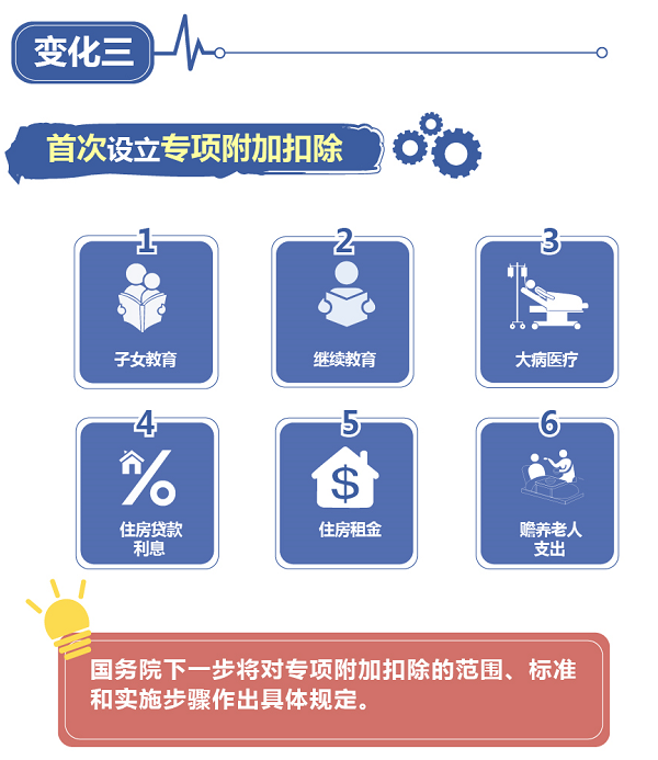 此次個(gè)稅改革還首次設(shè)立專項(xiàng)附加扣除,這是改革的突出亮點(diǎn),圍繞與群眾生活密切相關(guān)的支出領(lǐng)域,在現(xiàn)行稅法基本養(yǎng)老、醫(yī)療、失業(yè)保險(xiǎn)金和住房公積金稅前扣除的基礎(chǔ)上,額外增加子女教育、繼續(xù)教育、大病醫(yī)療、住房貸款利息或住房租金、贍養(yǎng)老人等6項(xiàng)專項(xiàng)附加扣除,將進(jìn)一步增強(qiáng)稅制的公平合理性。根據(jù)稅法授權(quán),國務(wù)院下一步將對(duì)專項(xiàng)附加扣除的范圍、標(biāo)準(zhǔn)和實(shí)施步驟作出具體規(guī)定。