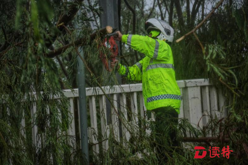 面對強大的臺風,艾力軍感到焦急又無奈?!罢娴氖锹穬膳缘臉湟豢每玫脑谖已矍暗瓜?疏通不完的排水口,清理不完的倒樹。”艾力軍對記者說。即便如此,他還是帶領隊員不斷的在風雨中努力嘗試不讓路被積水、倒樹堵死,一次次下車排除險情。