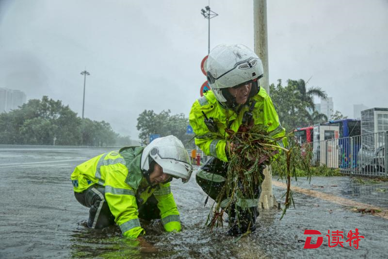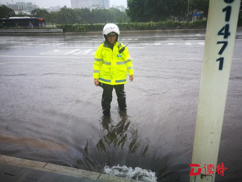 但是,眼前的情況,他們無法視而不見。深鹽二通道下方,羅沙路羅湖公安分局調頭口處,當艾力軍經(jīng)過這里時發(fā)現(xiàn)由于地勢低洼路面已經(jīng)嚴重積水,他們馬上停下車,疏通下水道。一行人在風雨中走進機動車道,沿著路邊只能用手在積水中摸索排水口的位置,將阻塞入水口的樹枝樹葉掏出來。但風急雨驟,道路積水水位剛下降一點,剛被清理的下水道又堵樹葉、樹枝等雜物堵上,他們只好不斷地進行著重復的動作。而此時,臺風“山竹”距離深圳接近130公里,羅湖片區(qū)測得最大陣風達16級。