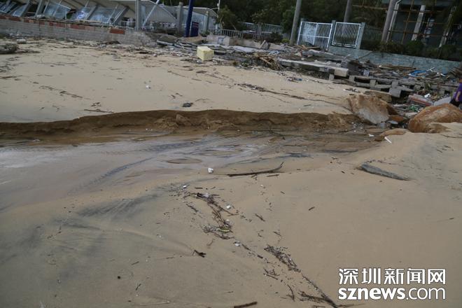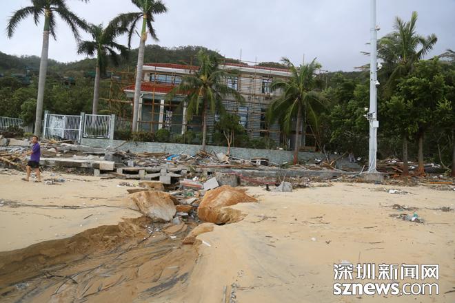 小梅沙旅游度假村景區(qū)內(nèi)沙灘海沙被卷走超7萬多立方,約2000米的堤岸及道路沖垮,公共、建筑設(shè)施及構(gòu)筑物全部受損,部分完全損毀,13處經(jīng)營管理場所損毀,綠化、樹木等嚴(yán)重破壞,直接經(jīng)濟(jì)損失預(yù)估超過5000萬元。