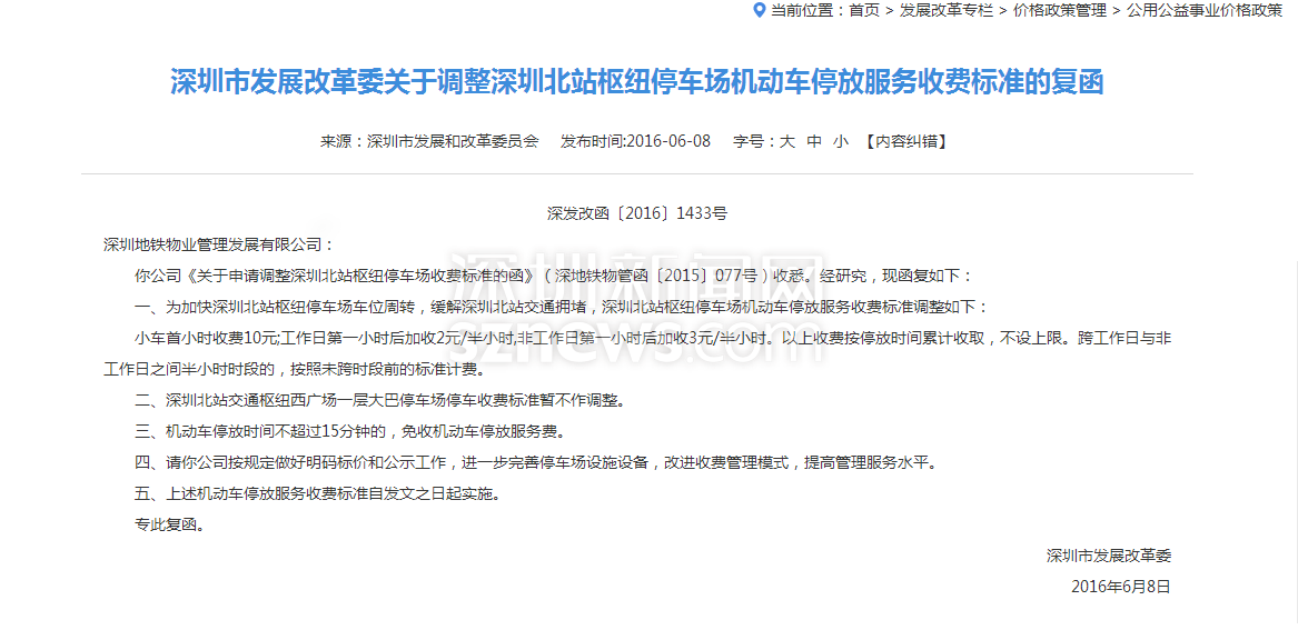2016年深圳市發(fā)改委調整深圳北站停車收費政策