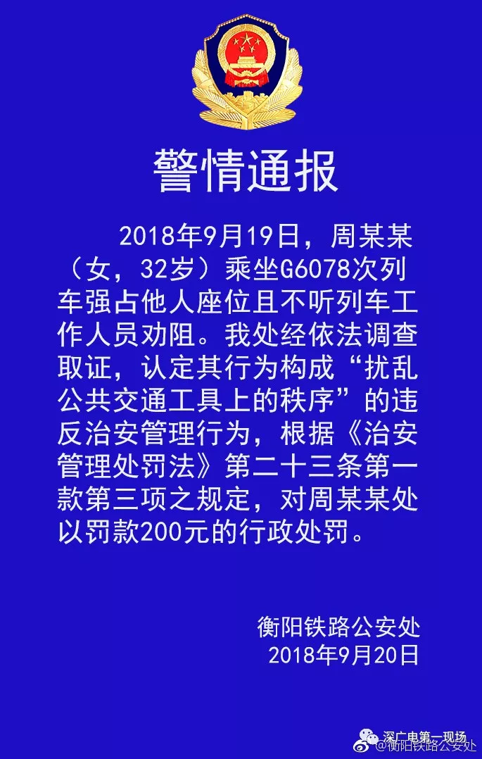 今天上午10點(diǎn)多,@衡陽鐵路公安處發(fā)布警情通報(bào)稱,2018年9月19日,周某某(女,32歲)乘坐G6078次列車強(qiáng)占他人座位且不聽列車工作人員勸阻。