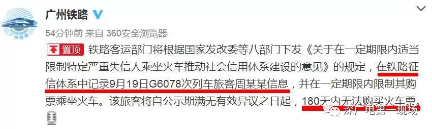 據(jù)@廣州鐵路今天上午10點(diǎn)25分通報(bào)稱,鐵路客運(yùn)部門將根據(jù)國家發(fā)改委等八部門下發(fā)《關(guān)于在一定期限內(nèi)適當(dāng)限制特定嚴(yán)重失信人乘坐火車推動(dòng)社會(huì)信用體系建設(shè)的意見》的規(guī)定,在鐵路征信體系中記錄9月19日G6078次列車旅客周某某信息,并在一定期限內(nèi)限制其購票乘坐火車。