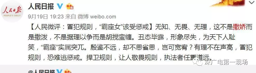 對(duì)此,@人民日?qǐng)?bào)官方微博昨晚發(fā)表評(píng)論【冒犯規(guī)則,“霸座女”該受懲戒】:無知、無畏、無理,這不是撒嬌而是撒潑,不是據(jù)理以爭而是胡攪蠻纏。丑態(tài)畢露,形象盡失,為天下人恥笑,“霸座”實(shí)屬突兀。殷鑒不遠(yuǎn),卻不思省思,豈可寬宥?有理不在聲高,冒犯規(guī)則,恐難逃懲戒。捍衛(wèi)規(guī)則,讓人敬畏規(guī)則,執(zhí)法者任重道遠(yuǎn)。