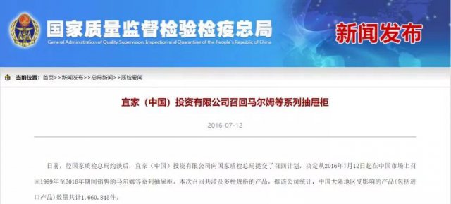 2016年7月12日,國家質檢總局官網(wǎng)宣布,經(jīng)約談后,宜家(中國)投資有限公司向國家質檢總局提交了召回計劃,決定在中國市場上召回1999年至2016年期間銷售的馬爾姆等系列抽屜柜。本次召回中國大陸地區(qū)受影響的產(chǎn)品 (包括進口產(chǎn)品 )數(shù)量共166萬件。