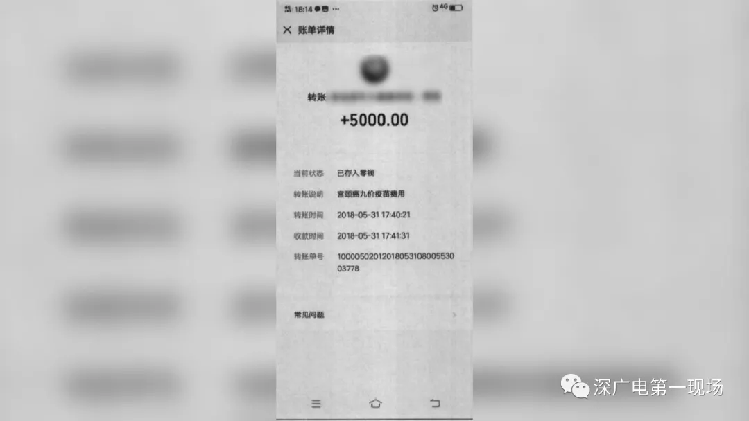 今年5月份,寶安的郭小姐接到前同事蔣某的推銷電話,自稱可以預(yù)約到香港注射HPV9價疫苗,而郭小姐剛好有這方面的需求,眼看辦公室的好多女生都轉(zhuǎn)錢找蔣某預(yù)約,自己不假思索也轉(zhuǎn)了五千。
