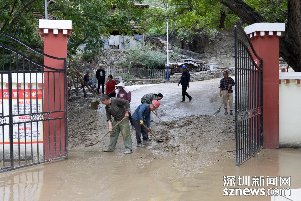 村干部在清除泥石流造成的污泥淤積